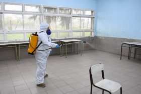 En esta ocasión, los equipos de Salud desinfectan las escuelas provinciales que reciben el Servicio Alimentario Escolar y cuidan a los voluntarios involucrados en la tarea de garantizar los alimentos a los alumnos de San Fernando. “Estamos desinfectando los establecimientos que nos ha pedido la inspectora distrital para cuidar la salud de los docentes y dar tranquilidad a los padres que van a retirar el bolsón”, dijo la Subsecretaria Eva Andreotti.