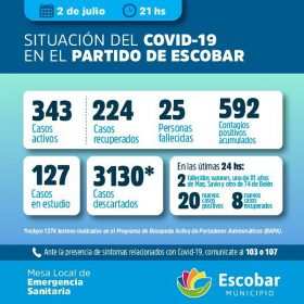 La Mesa local de Emergencia Sanitaria del Partido de Escobar, dio a conocer esta noche dos nuevos fallecimientos por coronavirus en el distrito, lo que eleva a 25 la cifra de muertos por esta causa desde marzo pasado.