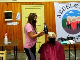 compartimos una gran jornada, junto a los adultos mayores y sus nietos”, mientras Romina, con mucho amor y cuidado daba los últimos retoques a una abuela, que va a estrenar corte en Semana Santa