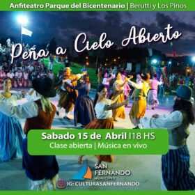 A las 18 horas en el anfiteatro del Parque del Bicentenario (Berutti y Los Pinos) una nueva “Peña a Cielo Abierto” con clase abierta a cargo de Tony Martínez, la voz de Lean Sánchez, el grupo Danzarte y el cierre a cargo de “Nogal”.