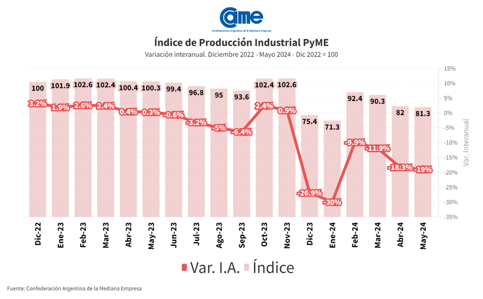 La actividad manufacturera de las pymes descendió 19% anual en mayo y acumula una retracción de 19,1% en los primeros cinco meses del año frente al mismo periodo de 2023. Los resultados dan cuenta de un debilitamiento de la demanda y un deterioro de la situación financiera.