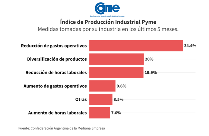 Las empresas valoraron la mayor estabilidad en el precio de los insumos del quinto mes del año, pero mostraron su preocupación por los montos que se están pagando por el consumo de energía y transporte, en un contexto de tan baja demanda. Algunos productores sostuvieron que la están pasando mal, pero con la esperanza de un repunte cercano. Como consecuencia, el 34,4% de las firmas consultadas estuvieron achicando gastos operativos, mientras que otro grupo, representado en un 19,9%, redujo horas de trabajo para suplir la falta de ventas.