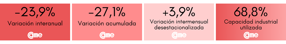 El sector tuvo una contracción anual de 20,6%, sin embargo, creció 4,6% en la comparación mensual. Para los primeros cinco meses del año, suma una caída de 23% frente a los mismos meses de 2023. Las industrias operaron al 66,6% de su capacidad instalada, los mismos niveles del mes anterior.