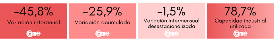 La actividad se hundió 45,8% anual a precios constantes, siendo nuevamente el ramo con mayor retroceso. En términos mensuales, también se registró una retracción de 1,5% y para los primeros cinco meses del año, la actividad acumula una caída de 25,9% frente a los mismos meses del año pasado. Las empresas operaron con 78,7% de su capacidad instalada, niveles altos tanto en el comparativo histórico como en relación con otros rubros, pero que sólo se explica por los bajos niveles de inversiones. Las mismas hace tiempo que están frenadas en el sector porque es una de las actividades que primero comenzaron a sentir la crisis.