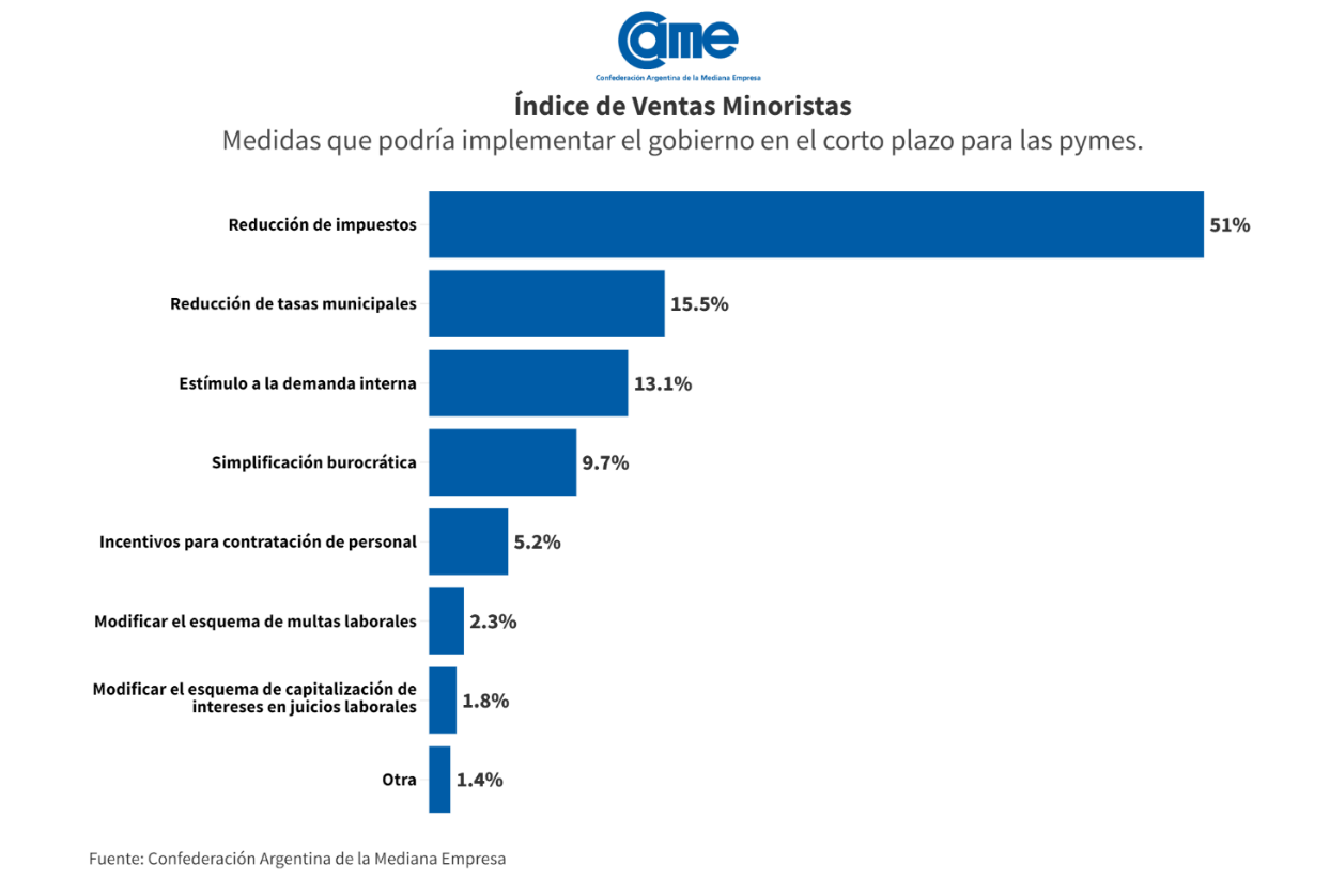Se les consultó a los encuestados qué medidas podría implementar el gobierno en el corto plazo para ayudar a las pymes. El 51% indicó que deberían reducir impuestos, 15,5% considera que habría que bajar las tasas municipales y otro 13,1% cree que tendrían que estimular la demanda interna.