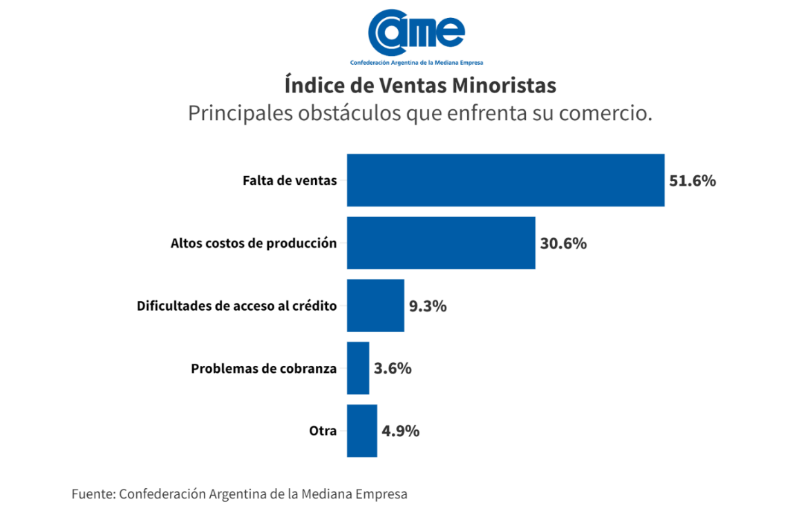 Por otro lado, más de la mitad de los comerciantes encuestados (51,6%) señaló la falta de ventas como el principal obstáculo que está enfrentando su negocio. En segundo lugar, el 30,6% apuntó a los altos costos de producción.