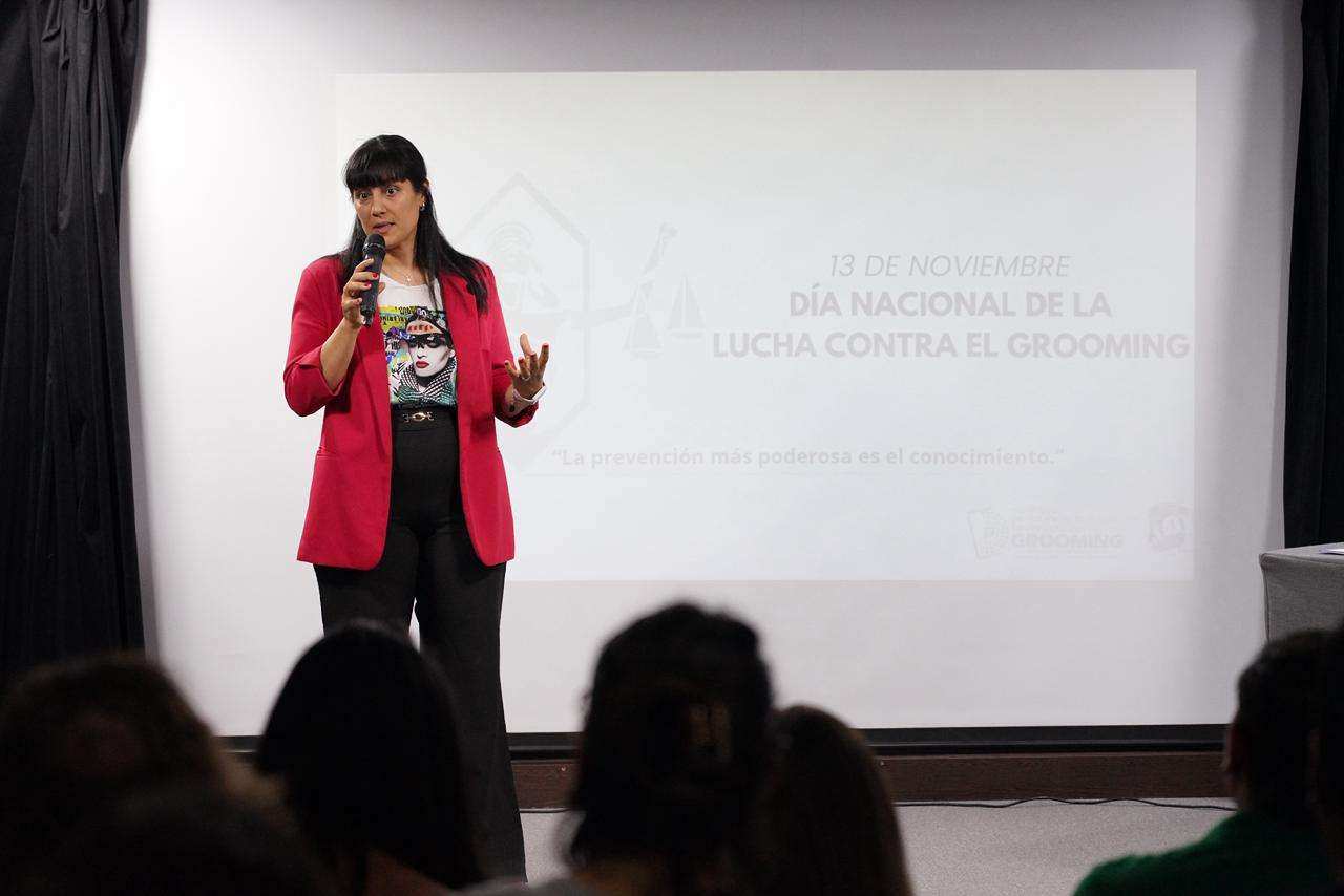 Entre las disertantes estuvo Roxana Domínguez, fundadora de la organización Mamá en Línea y actual directora del Instituto de Políticas Públicas de Prevención del Grooming de la Provincia de Buenos Aires. Domínguez comenzó su labor tras la experiencia de su hija Ayelén, víctima de grooming en 2009, y desde entonces impulsa políticas públicas de protección y acompañamiento a las familias.