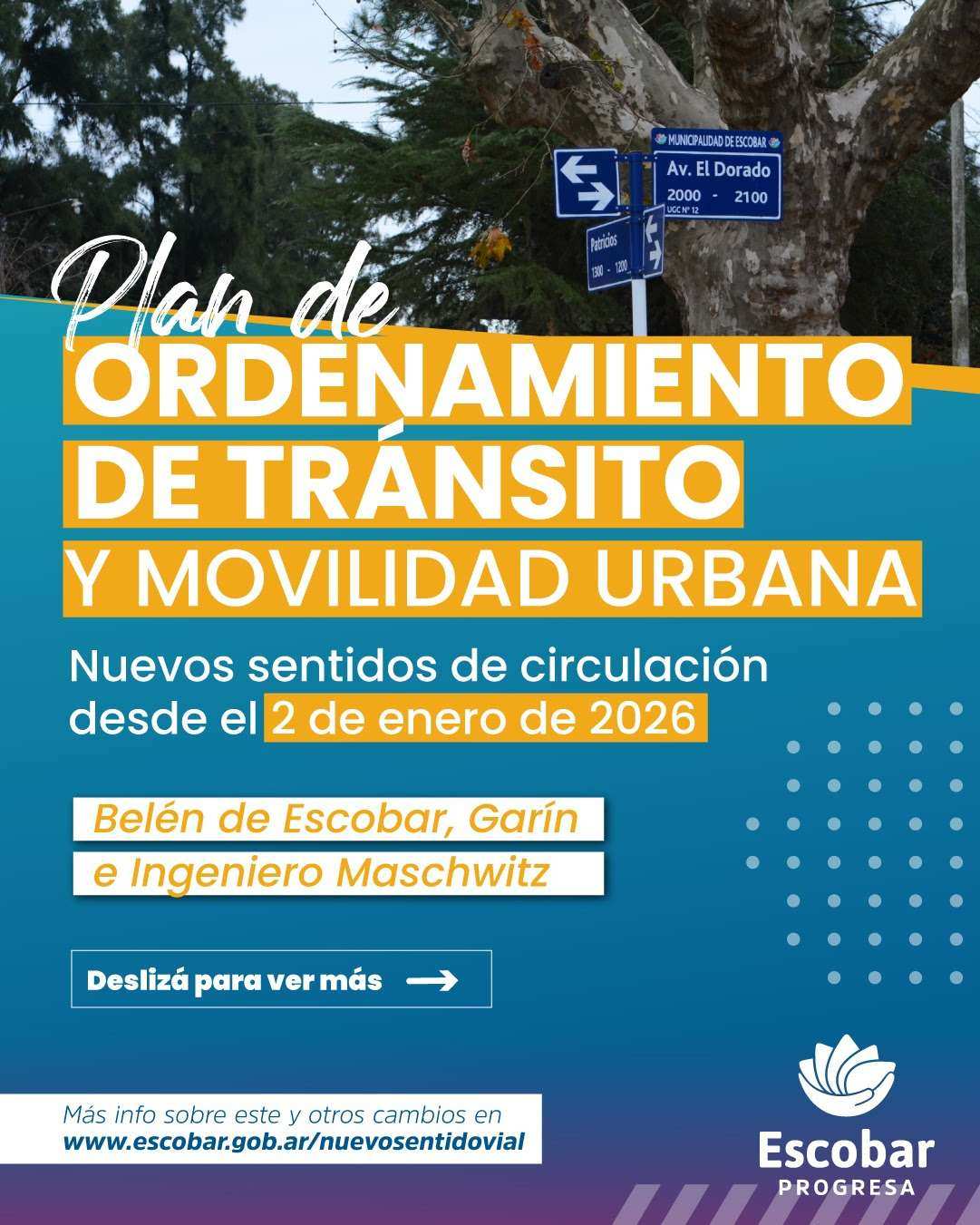 La Agencia Municipal de Tránsito y Transporte dispuso que los cambios se apliquen recién el 2 de enero de 2026, para informar con tiempo de las novedades a los vecinos y automovilistas de cada una de las zonas afectadas. Esto incluye reuniones y visitas a frentistas de cada uno de los sectores involucrados. Las novedades estarán nucleadas también en la web www.escobar.gob.ar/nuevosentidovial.